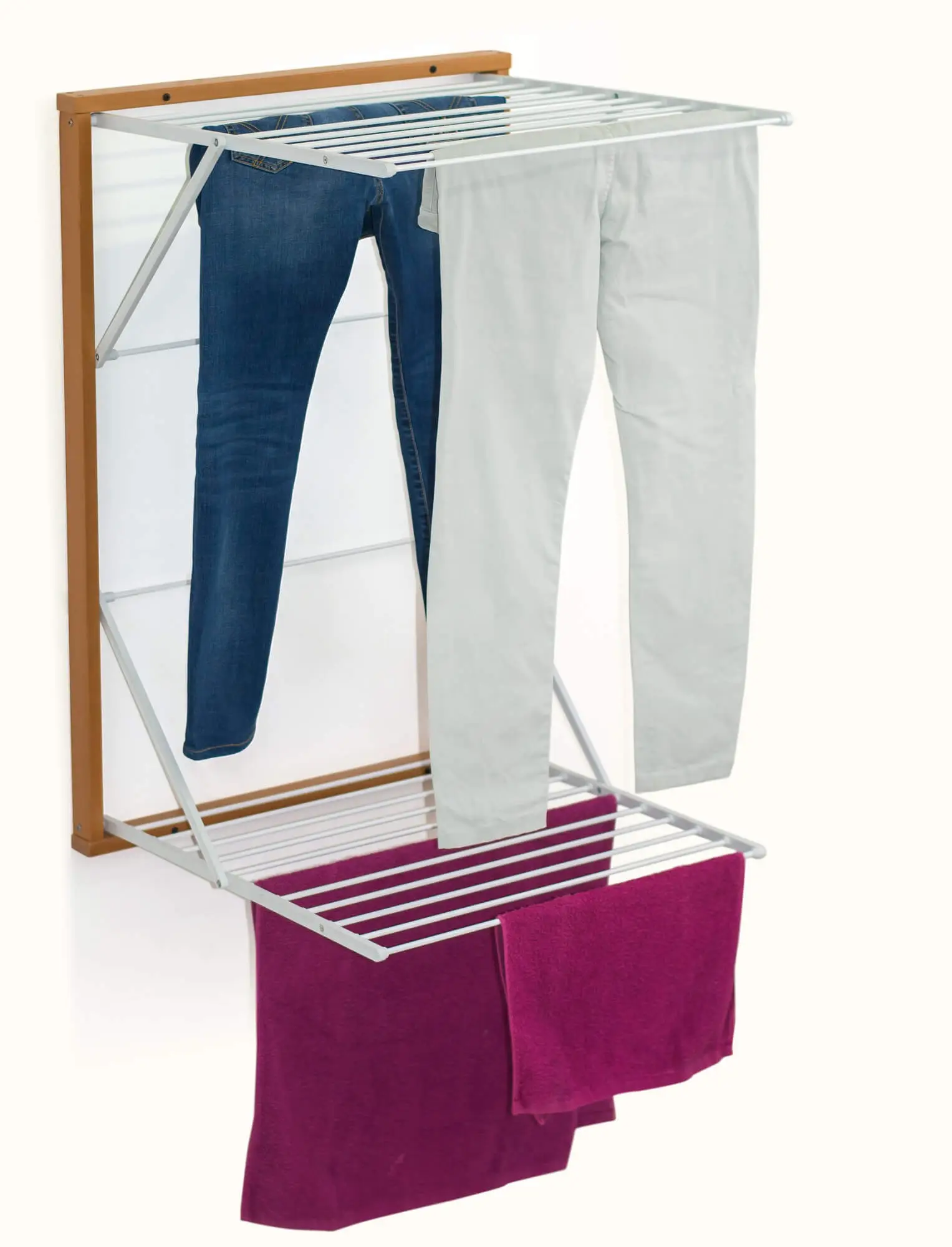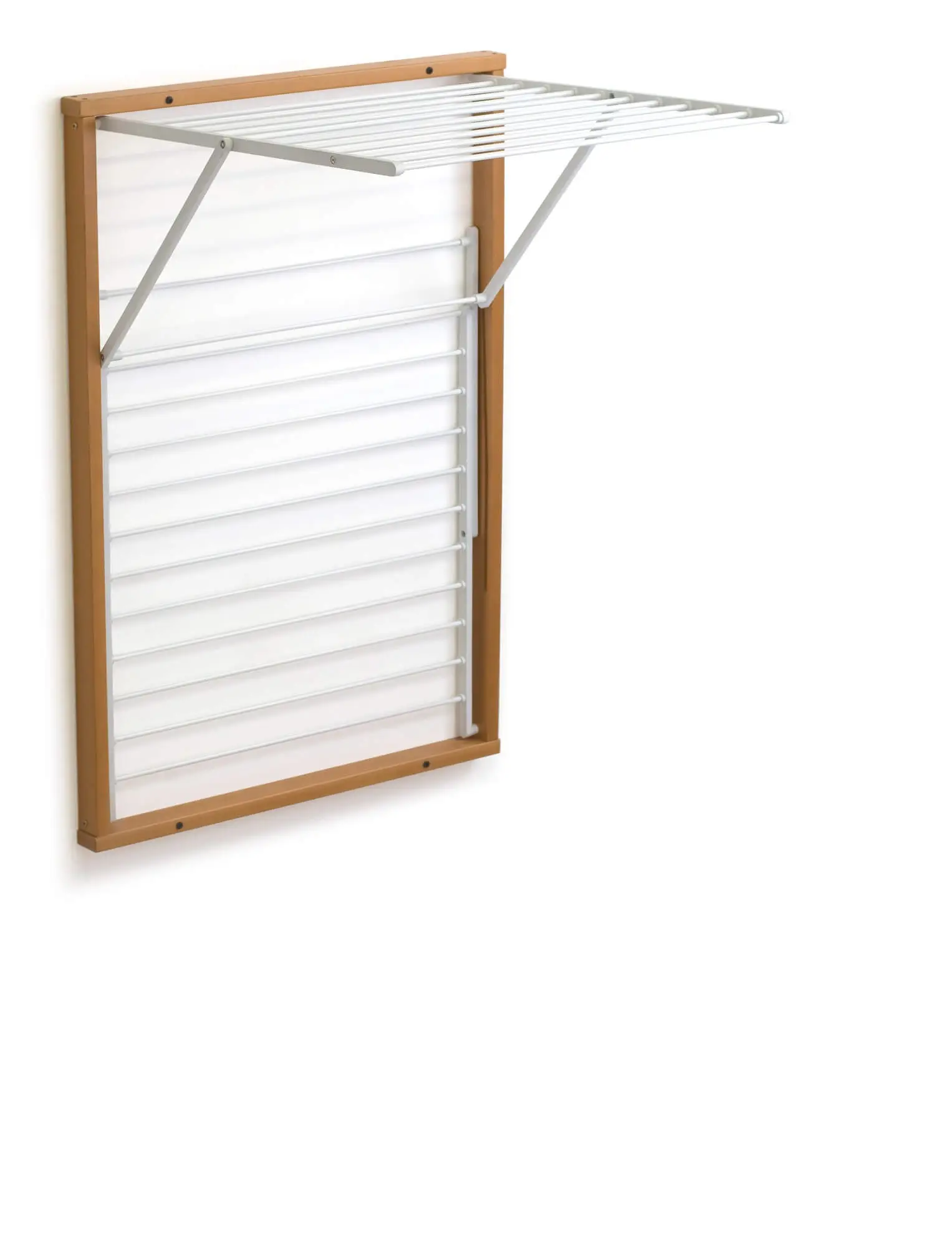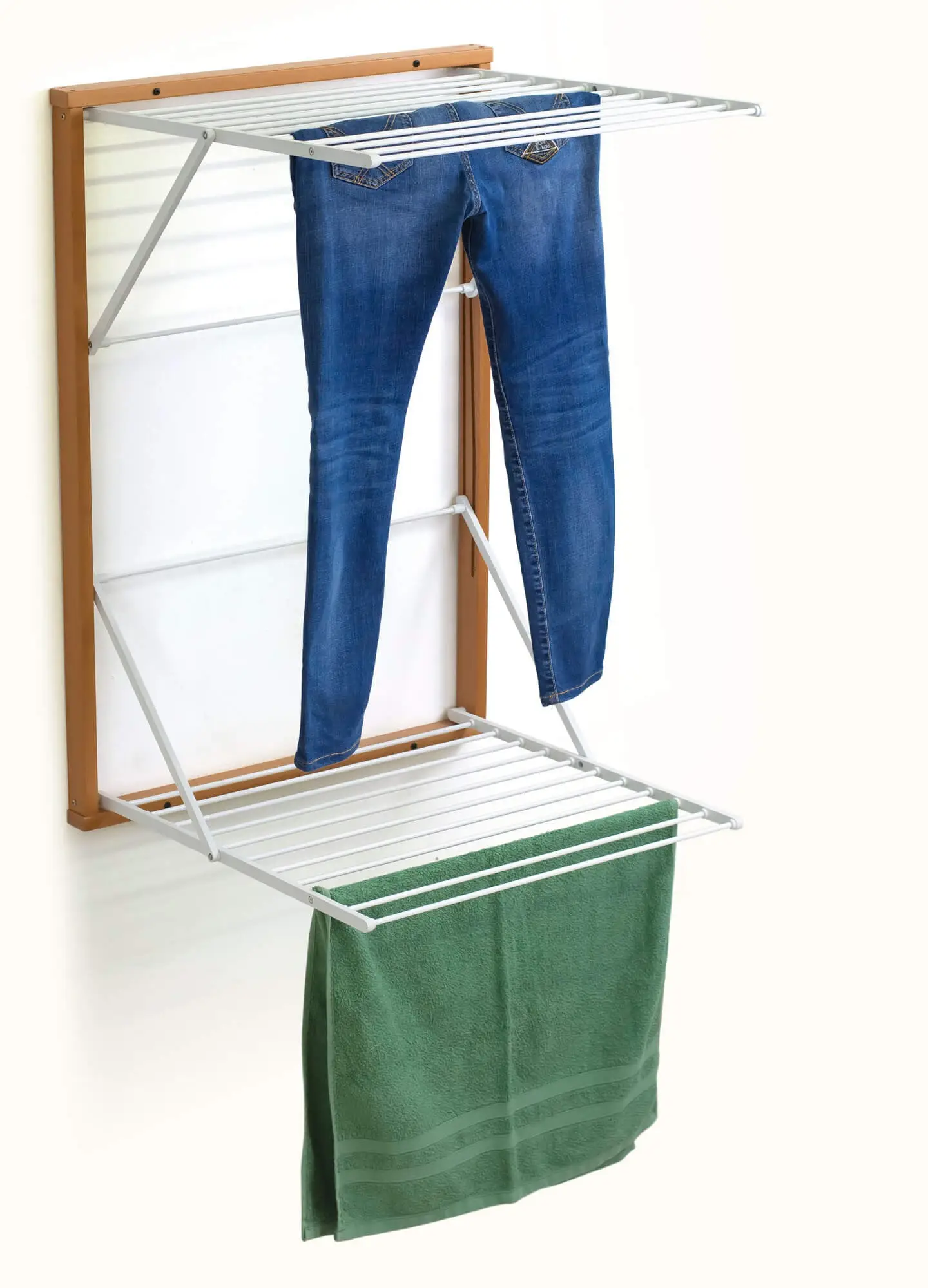 Solidna konstrukcja z litego drewna bukowego nadaje suszarce eleganckiego wyglądu, który harmonizuje z różnymi stylami wnętrz. Dwa niezależne poziomy, o łącznej powierzchni suszenia 13 metrów, umożliwiają swobodne rozmieszczenie odzieży. Pokryte aluminium druty zapewniają stabilne podparcie dla prania. Dzięki prostemu systemowi otwierania i składania, korzystanie z suszarki jest niezwykle wygodne, a łatwy system montażu na ścianie pozwala na szybkie i bezproblemowe zawieszenie jej w wybranym miejscu.