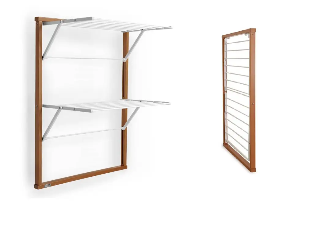 Solidna konstrukcja z litego drewna bukowego nadaje suszarce elegancki wygląd, który idealnie komponuje się z różnymi stylami wnętrz. Pokryte aluminium druty, o łącznej długości 9 metrów, zapewniają stabilne podparcie dla prania. Dwa niezależne poziomy umożliwiają swobodne rozmieszczenie ubrań według aktualnych potrzeb. Dzięki łatwemu systemowi otwierania i składania korzystanie z suszarki jest niezwykle wygodne.