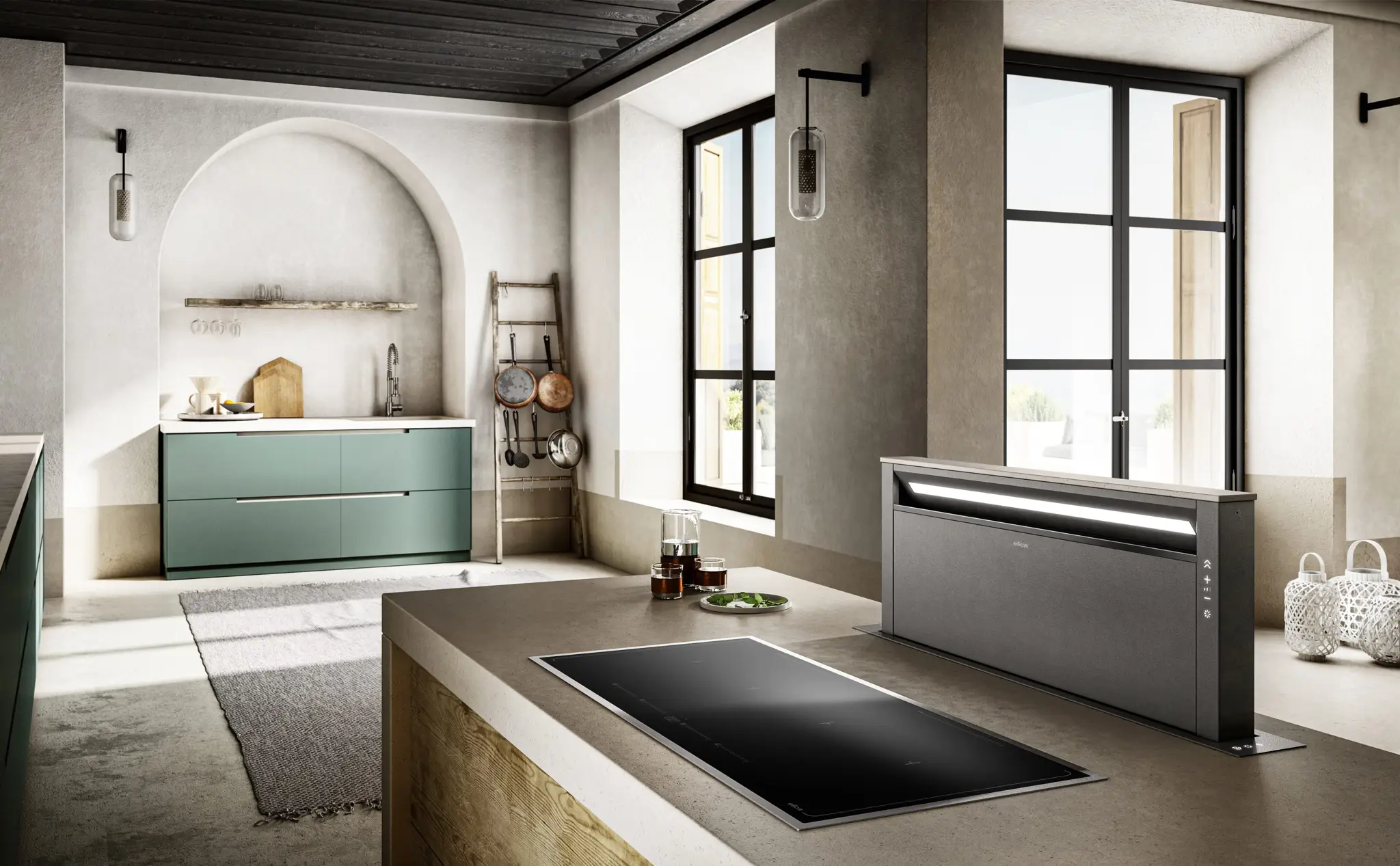 Estetyka połączona z waszymi pragnieniami. Estetyczne połączenie wyciągu ze stylem kuchni jest zmaksymalizowane dzięki wykończeniom w kolorze czarnym, stali nierdzewnej i efektu żeliwa. Możecie go również pokryć tym samym materiałem, co blat kuchenny, aby uzyskać jednolity, niestandardowy wygląd. Również komfort użytkowania został zaprojektowany tak, aby ułatwić życie, umożliwiając regulację intensywności światła i zarządzanie przepływem powietrza.