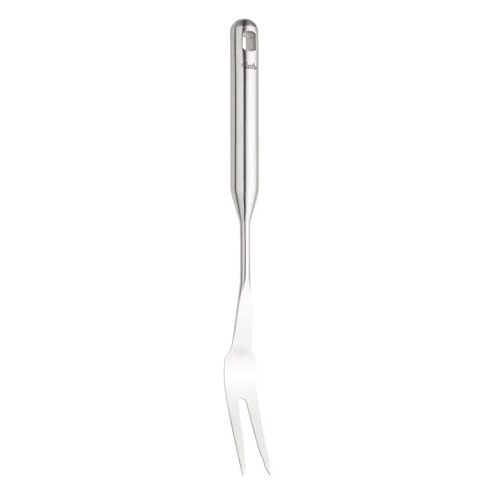Widelec do mięsa o rozmiarze 37 cm marki Fissler z serii Essential® umożliwia łatwe krojenie oraz bezpieczne serwowanie gorących potraw. Dwa solidne zęby pewnie stabilizują mięso podczas krojenia, zapewniając precyzyjne cięcie bez przesuwania się, a wykonanie z wysokiej jakości stali nierdzewnej 18/10 gwarantuje trwałość i odporność na korozję.