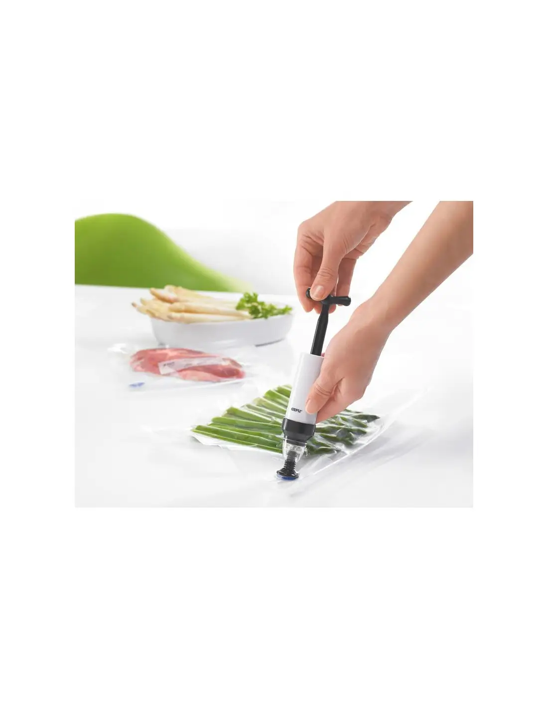 Zestaw próżniowy VACO firmy GEFU to absolutnie niezbędne narzędzia do gotowania metodą sous vide. Dzięki niemu jedzenie może być przechowywane 5 razy dłużej, a witaminy i składniki odżywcze są zachowane. Pompka ręczna wykonana z tworzywa ABS, worki wykonane z tworzywa PE. Worki próżniowe są wielokrotnego użytku. Są bezpieczne dla żywności i można je używać w mikrofalówce.