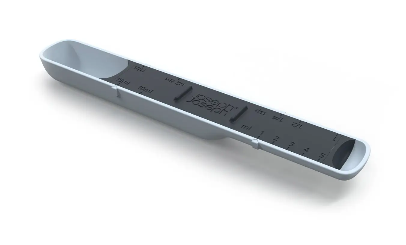 Marka Joseph Joseph tworzy funkcjonalne produkty o nowoczesnym, unikalnym designie z materiałów o wysokiej jakości. Prezentowana praktyczna przesuwna miarka kuchenna w formie łyżki wykonana została z jasnoniebieskiego i ciemnoszarego tworzywa sztucznego wolnego od BPA. Posiada ona łatwą do odczytania skalę 5-15 ml, pozwala także wygodnie odmierzyć składniki w łyżeczkach do herbaty oraz łyżkach stołowych. Należy ją dostosowywać do pożądanej miary przed napełnieniem jej odmierzanym składnikiem. Miarka nadaje się zarówno do produktów mokrych jak i suchych m.in. cukru, oleju, soli czy przypraw, co pozwoli na ograniczenie ilości używanych miarek lub łyżek. Ze względu na swój niewielki rozmiar jest ona łatwa w przechowywaniu. Możliwość demontażu z kolei ułatwia jej czyszczenie - produkt można myć ręcznie lub w zmywarce po rozłożeniu. Przed jego użyciem należy upewnić się, że jest on całkowicie suchy. Produktu nie należy używać w kuchence mikrofalowej.