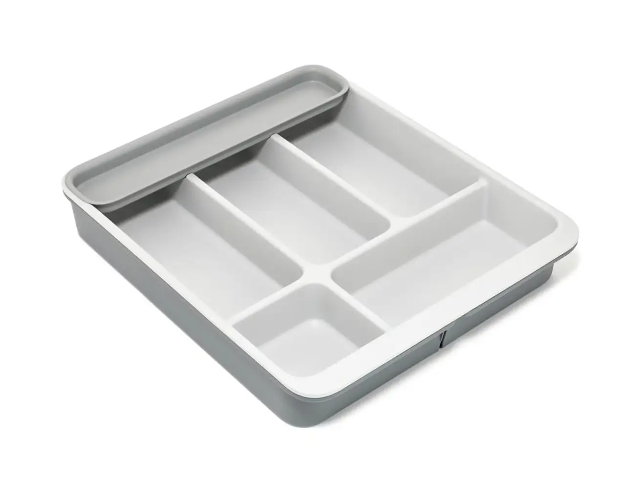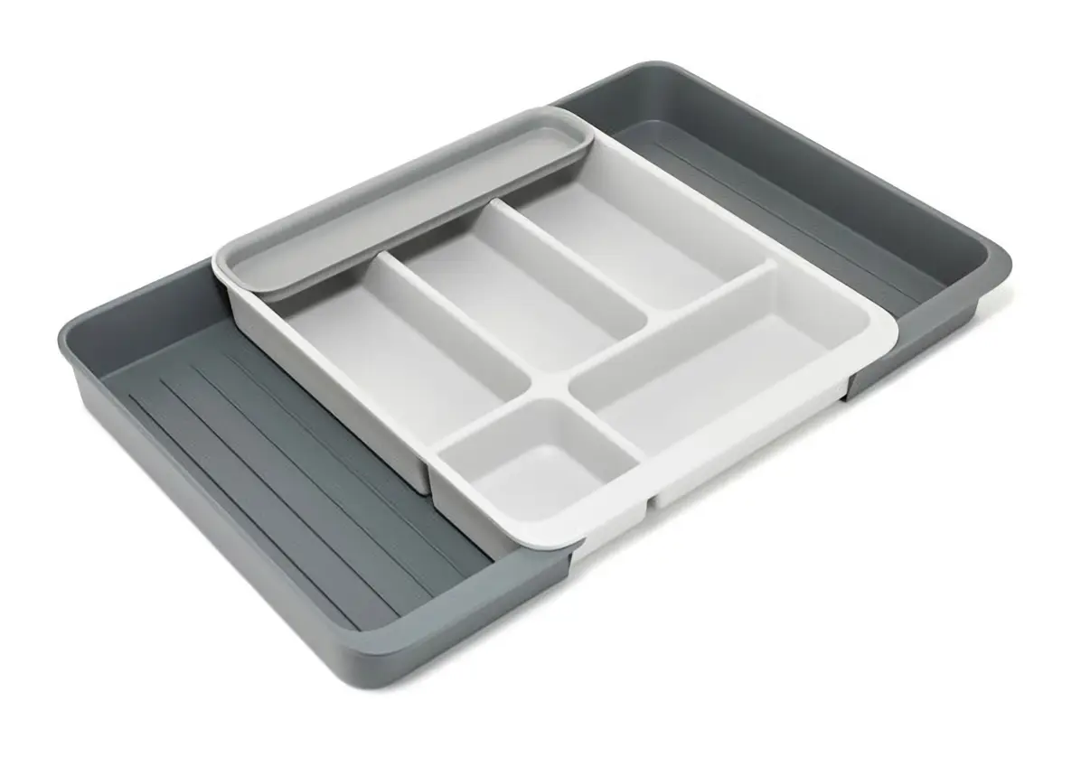 Prezentowany organizer o wymiarach 40,5 x 34 x 6,5 cm (dł. x szer. x wys.) w odcieniach szarości pomoże utrzymać porządek w szufladzie kuchennej i ułatwi organizację akcesoriów. Wyposażono go w 5 głębokich przegródek na sztućce oraz akcesoria kuchenne, długą komorę idealną do przechowywania np. patyczków do szaszłyków lub dłuższych przyborów oraz boczne, rozsuwane sekcje umożliwiające przechowywanie większych utensyliów kuchennych. Organizer wykonany został z tworzywa sztucznego w minimum 50% pochodzącego z recyklingu, przez co mogą wystąpić niewielkie różnice w kolorze oraz drobne kropki na powierzchni - nie ma to wpływu na jego trwałość ani funkcjonalność. Produkt w razie potrzeby należy myć ręcznie i dokładnie osuszyć przed ponownym użyciem.