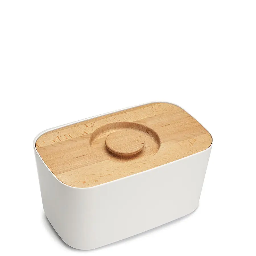 Pojemnik- w przeciwieństwie do swojego pierwowzoru- posiada delikatne zaokrąglone rogi. Nadaje mu to swoistej lekkości, nie ujmując przy tym nic z funkcjonalności. Produkt składa się z pojemnika wykonanego z melaminy oraz pokrywy wykonanej z drewna bukowego.