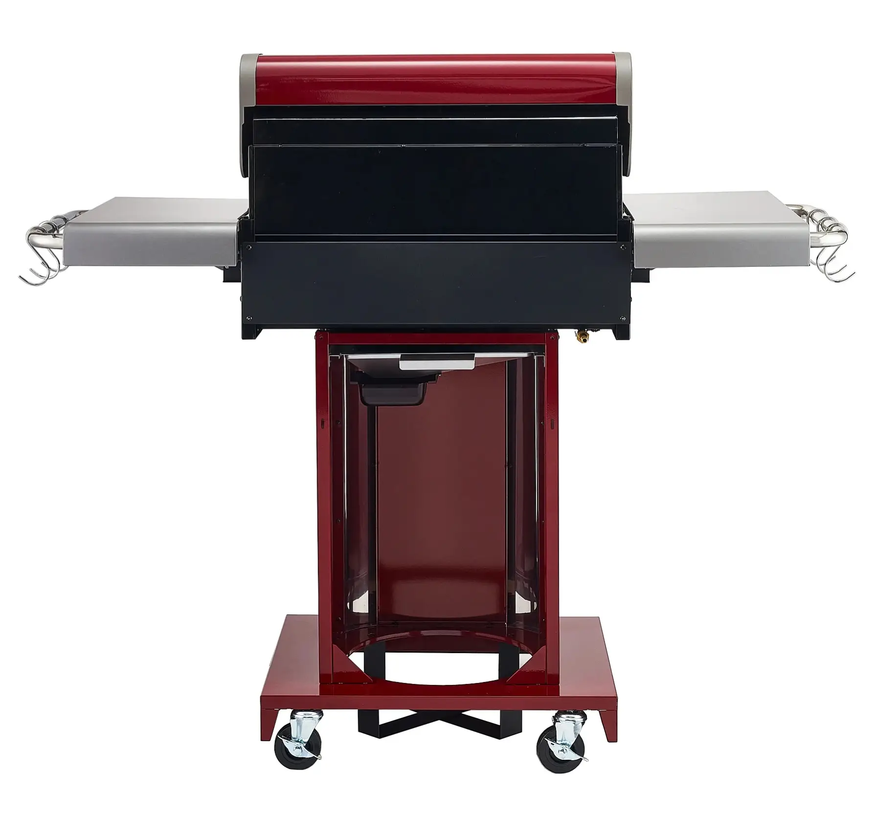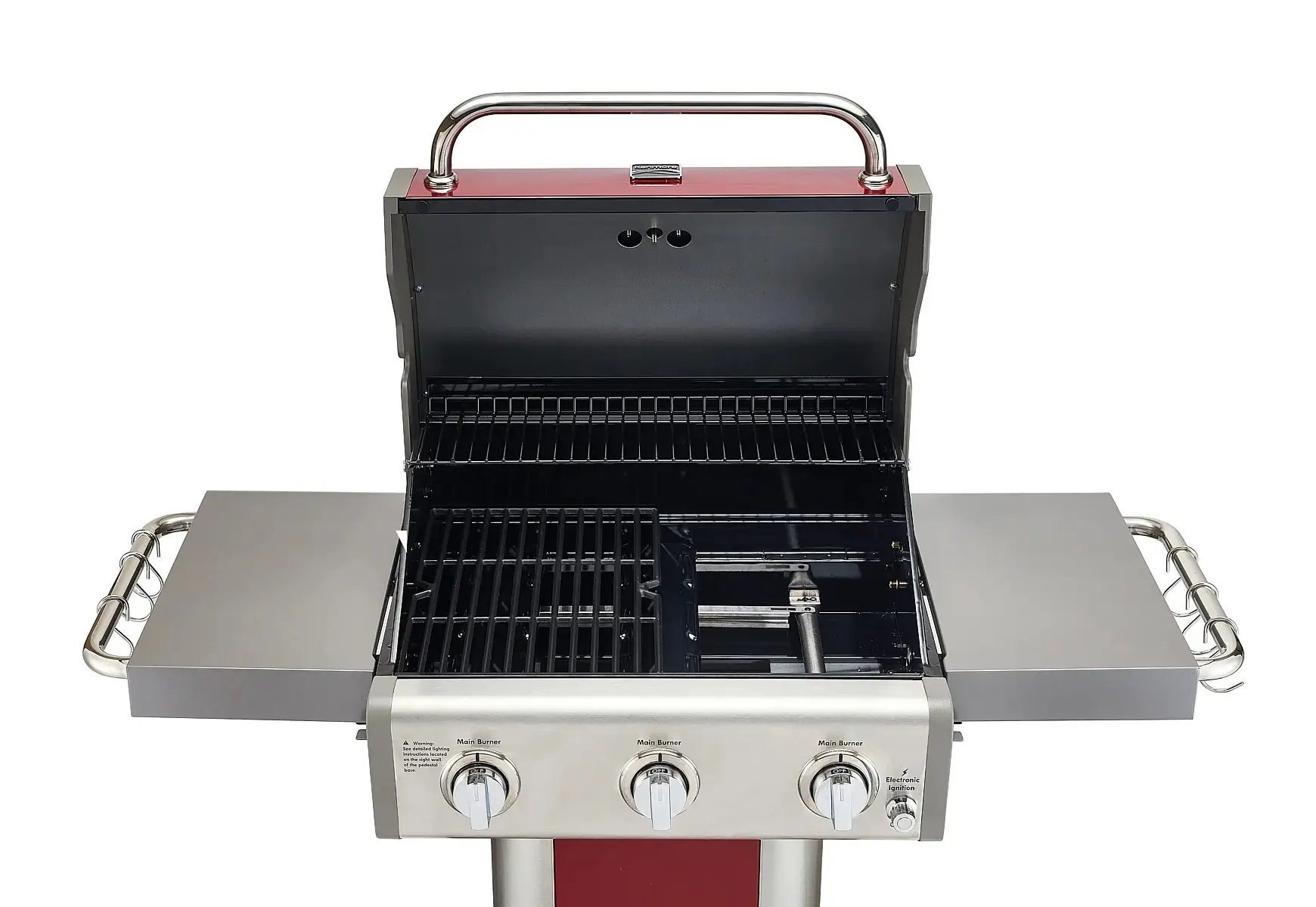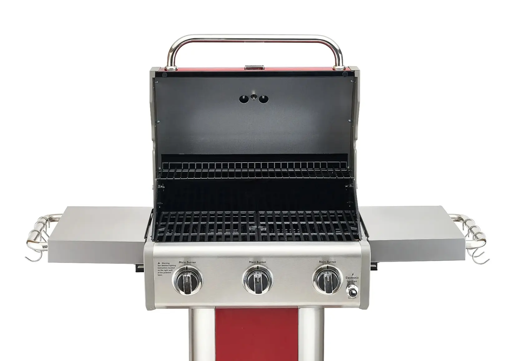 Prezentowany grill w czerwonym kolorze wykonano w całości z grubej, wysokiej jakości stali. Palenisko o mocy 9 kW i dwuczęściowy żeliwny ruszt zapewniają równomierną dystrybucję ciepła, umożliwiając szybkie i efektywne grillowanie. Posiada on również ruszt górny z emaliowanej stali nierdzewnej, który w połączeniu z głównym daje łączną powierzchnię grillowania 0,32 m2. Grill wyposażono w 3 palniki obsługiwane trzema wygodnymi chromowanymi pokrętłami, które umożliwiają precyzyjną kontrolę wielkości każdego z płomieni. Składane boczne półki ułatwiają grillowanie - można na nich umieścić tacki itp., a praktyczne haczyki wykorzystać do zawieszenia akcesoriów do grillowania tak by były łatwo dostępne. Dodatkowo ułatwiają one przechowywanie, oszczędzając miejsce. Grill posiada także elektryczny zapalnik, który działa na baterię AA, co umożliwia szybkie uruchomienie urządzenia bez potrzeby używania zapałek oraz aluminiową tackę ociekową, zbierającą tłuszcz i resztki. Dzięki 4 skrętnym kółkom jest on łatwy do przemieszczenia, a praktyczny hamulec zapewnia stabilność podczas użytkowania, unieruchamiając go. Pokrywę grilla wyposażono w czytelny termometr i wygodny uchwyt. Ponadto produkt nie posiada tylnego panelu co zapewnia łatwy dostęp do butli z gazem. Model jest kompatybilny z butlami gazowymi o różnych pojemnościach (5 kg, 8 kg, 11 kg).