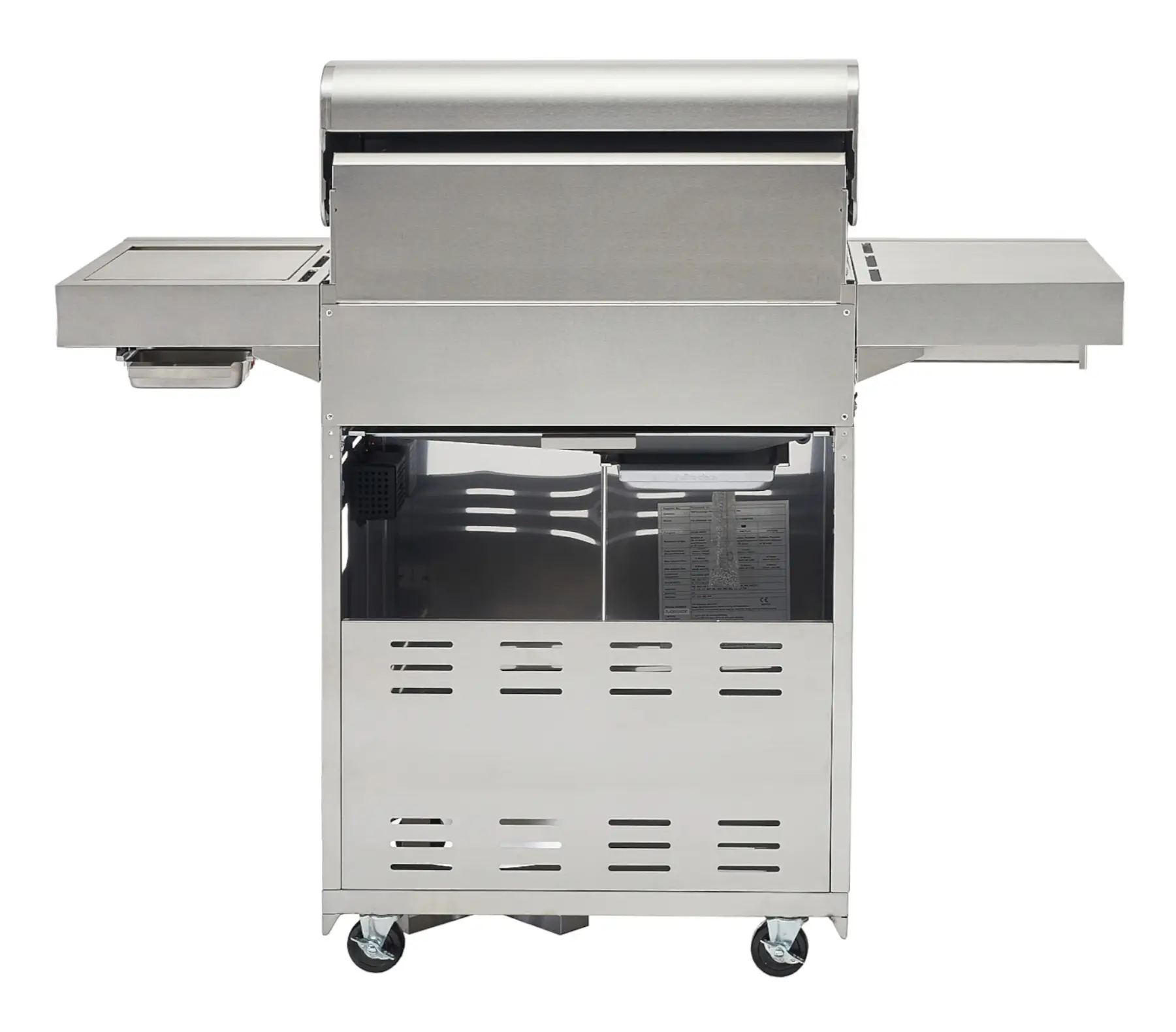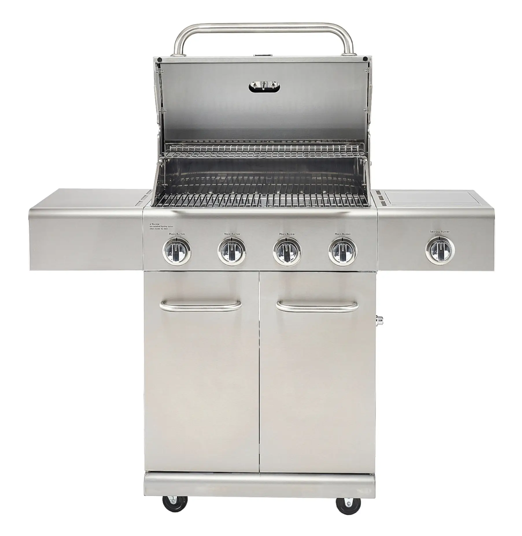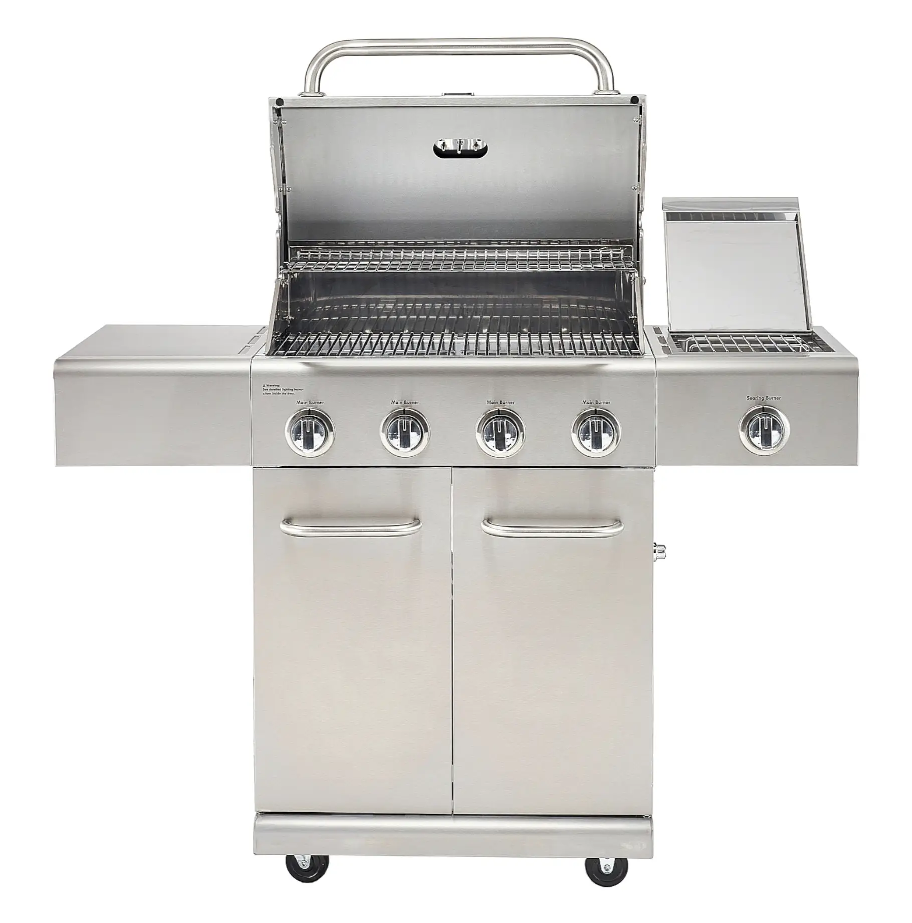 Prezentowany grill w srebrnym kolorze wykonano w całości z grubej, wysokiej jakości stali nierdzewnej. Palenisko o mocy 15,5 kW i dwuczęściowy ruszt zapewniają równomierną dystrybucję ciepła, umożliwiając szybkie i efektywne grillowanie. Posiada on również ruszt górny i boczny, prostokątny palnik ceramiczny na podczerwień o mocy 3,5 kW, idealny do opiekania steków lub szybkiego zagotowania wody. Grill wyposażono w 4 palniki główne obsługiwane wygodnymi chromowanymi pokrętłami, które umożliwiają precyzyjną kontrolę wielkości każdego z płomieni. Boczne półki ułatwiają grillowanie - można na nich umieścić tacki i akcesoria do grillowania tak by były łatwo dostępne itp.. Grill posiada niezawodny system zapłonu elektronicznego, który działa na baterię AA, co umożliwia szybkie uruchomienie urządzenia bez potrzeby używania zapałek oraz tackę ociekową, zbierającą tłuszcz i resztki. Dzięki skrętnym kółkom jest on łatwy do przemieszczenia - praktyczny hamulec zapewnia przy tym stabilność podczas użytkowania, unieruchamiając go. Pokrywę grilla wyposażono w czytelny termometr i wygodny uchwyt. Ponadto produkt posiada zamykaną szafką na butlę i akcesoria, zapewniającą łatwy dostęp do nich. Model jest kompatybilny z butlami gazowymi o różnych pojemnościach (5 kg, 8 kg, 11 kg).