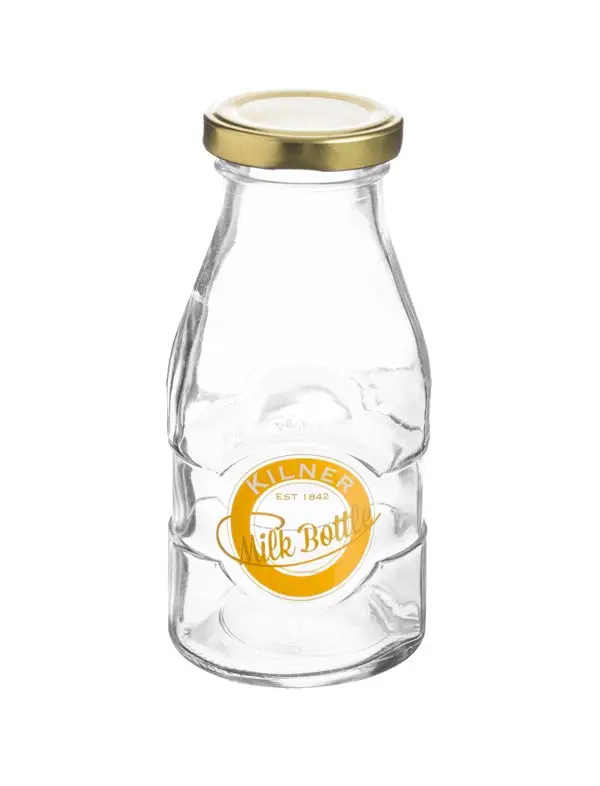 Mała butelka o pojemności 189 ml angielskiej marki Kilner idealnie sprawdzi się do serwowania mleka, kefiru czy świeżo wyciskanych soków. Metalowa zakrętka dołączona do każdej butelki umożliwia jej szczelne zamknięcie, co pozwala na dłuższe zachowanie świeżości ulubionych napojów. Butelka została wykonana z wysokiej jakości szkła z estetyczną grafiką na przedniej ściance. Zalecane jest ręcznie mycie produktu. Nie należy wlewać wrzątku.