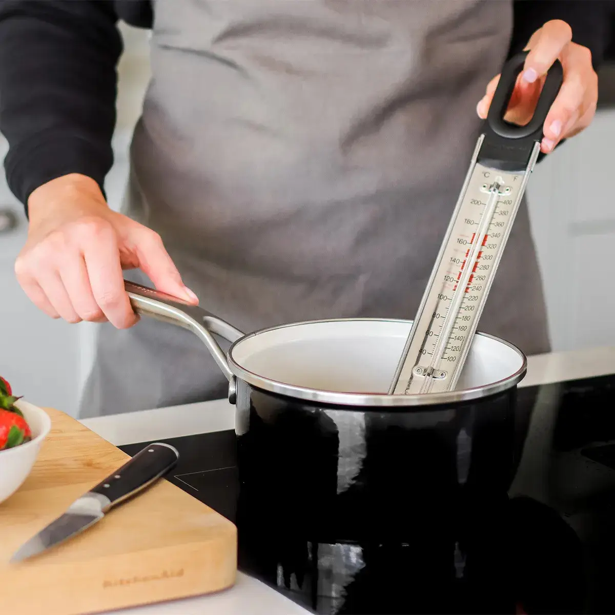 - duża czytelna skala z zaznaczonymi punktami dla: konfitur, syropów cukrowych, karmelu, toffiee oraz głębokiego smażenia pączków, faworków, mięs i warzyw