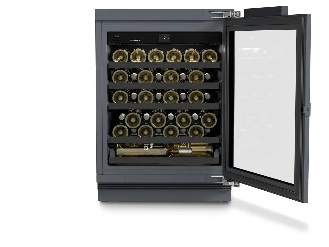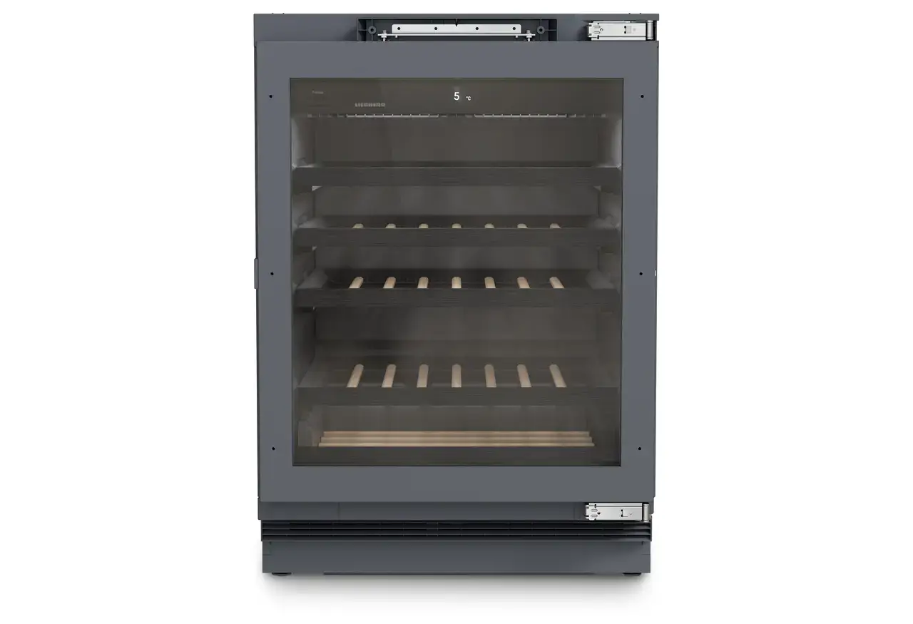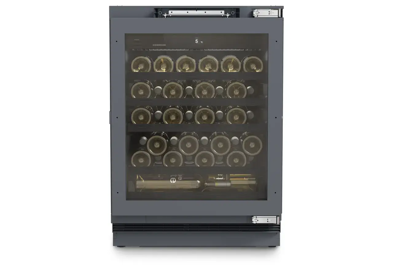 Liebherr UWpri 3761 Vinidor Selection to elegancka i pojemna lodówka na wino do zabudowy podblatowej, zaprojektowana z myślą o bezpiecznym przechowywaniu większej kolekcji win. Urządzenie mieści aż 44 butelki typu Bordeaux (0,75 l) i oferuje jedną precyzyjnie regulowaną strefę temperatury, idealną do przechowywania i dojrzewania trunków.