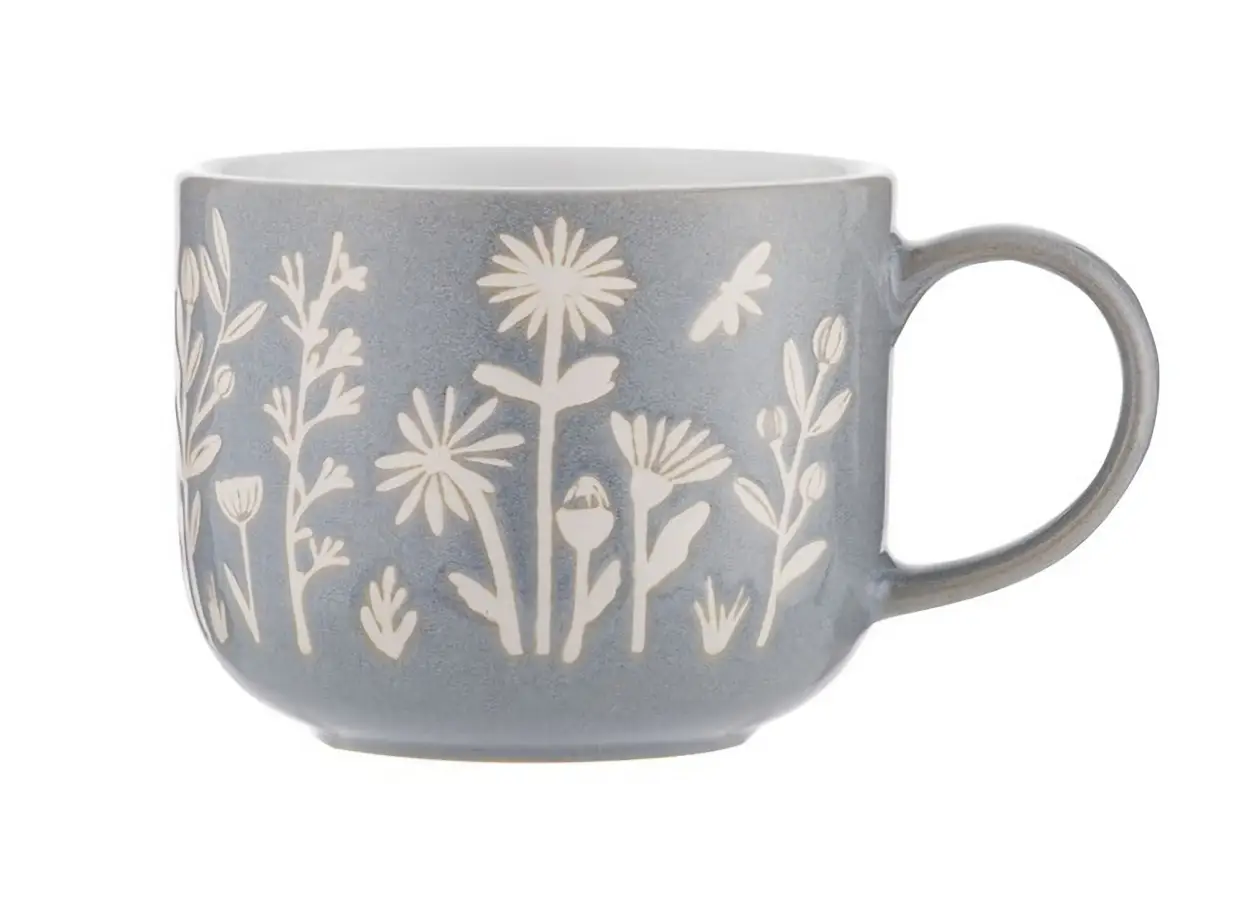 Prezentowany kubek o pojemności 400 ml i szaroniebieskim kolorze ozdobiony został wzorem stokrotek. Wykonany został z kamionki, która jest wytrzymała i nie przejmuje zapachów. Doskonale nadaje się do spożywania napojów zarówno na zimno jak i na ciepło, dzięki uchwytowi wygodnie leżąc w dłoni. Bardzo estetycznie się przy tym zaprezentuje na stoliku, idealnie odnajdując się w otoczeniu wiosennych zastaw i dekoracji. Dodatkową zaletą kubka jest możliwość podgrzania w nim napojów itp. w kuchence mikrofalowej. Produkt jest również łatwy w czyszczeniu - nadaje się zarówno do mycia ręcznego jak i z pomocą zmywarki.