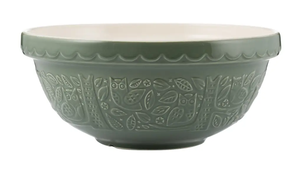 Prezentowana miska o średniej pojemności 2,7 L doskonale nada się do wygodnego mieszania składników oraz wyrabiania ciast. Wykonana została z odpornej na odpryskiwanie kamionki. Po zewnętrznej stronie pomalowano ją na zielony kolor, wewnątrz jest kremowa. Miska została wyposażona w brzeg do trzymania jedną ręką, co ułatwi korzystanie z niej. Ponadto nadaje się ona do mycia w zmywarce oraz używania w kuchence mikrofalowej. Unikalny wzór sów i roślin sprawia, że miska ciekawie zaprezentuje się w kuchni.