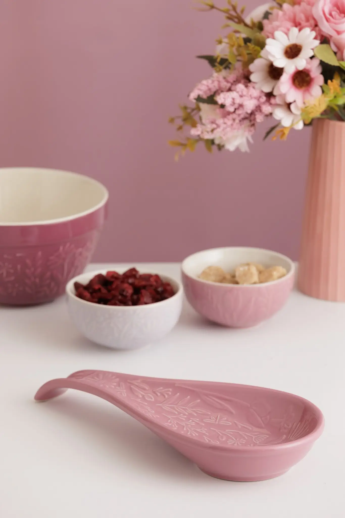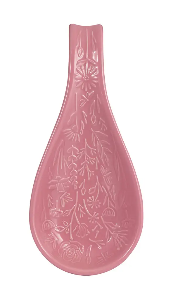 Prezentowana podstawka pod łyżkę o wymiarach 27 x 12 x 3,8 cm (dł. x szer. x wys.) ma różowy kolor i ozdobiono ją wzorem roślin i różnych kwiatów. Wykonana została ona z odpornej na odpryskiwanie kamionki, dzięki czemu jest wytrzymała i nie przejmuje zapachów. Doskonale sprawdzi się w kuchni podczas przygotowywania mas, sosów, sałatek, zup itp., pozwalając na odłożenie łyżki, tak by była łatwo dostępna, a jednocześnie na blacie panował porządek. Produkt przeznaczony jest do mycia ręcznego.
