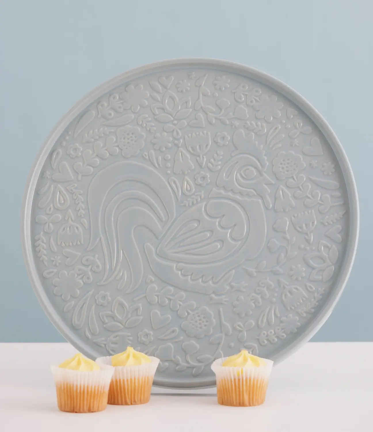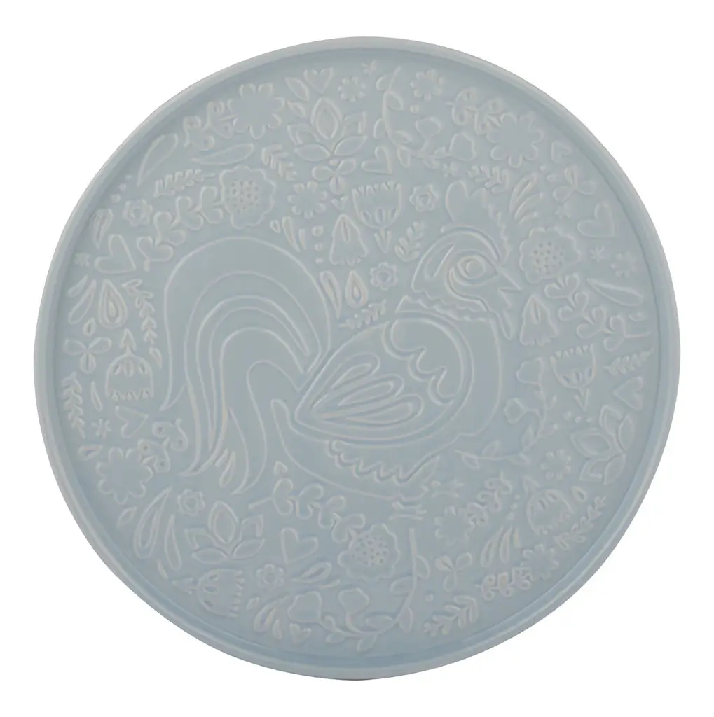 Prezentowany półmisek o wymiarach 30 x 2 cm (śr. x wys.) wykonany został z kamionki, która nie absorbuje zapachów i nie wpływa na smak. Idealnie nada się on do serwowania babeczek, kanapek, ciastek itp. estetycznie prezentując się na blacie lub stoliku. Półmisek ma powierzchnię w niebieskim kolorze z wypukłym wzorem koguta i kwiatów. Należy go myć wyłącznie ręcznie.