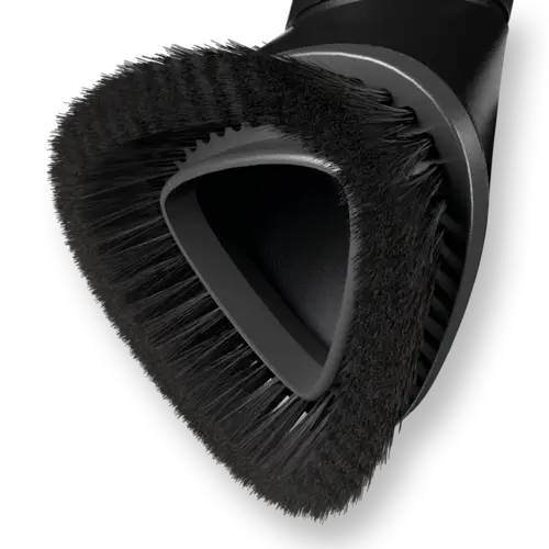 Ssawka pędzlowa Miele HX-DB to akcesorium przeznaczone do odkurzaczy bezprzewodowych Miele, takich jak Triflex HX1, HX2 czy Duoflex HX1. Wyposażona w obrotowy przegub, umożliwia precyzyjne czyszczenie wąskich szczelin, kątów oraz innych trudno dostępnych miejsc. Dzięki miękkim włoskom, jest idealna do delikatnych powierzchni, takich jak listwy przypodłogowe, wnętrza samochodu czy sprzęt elektroniczny.