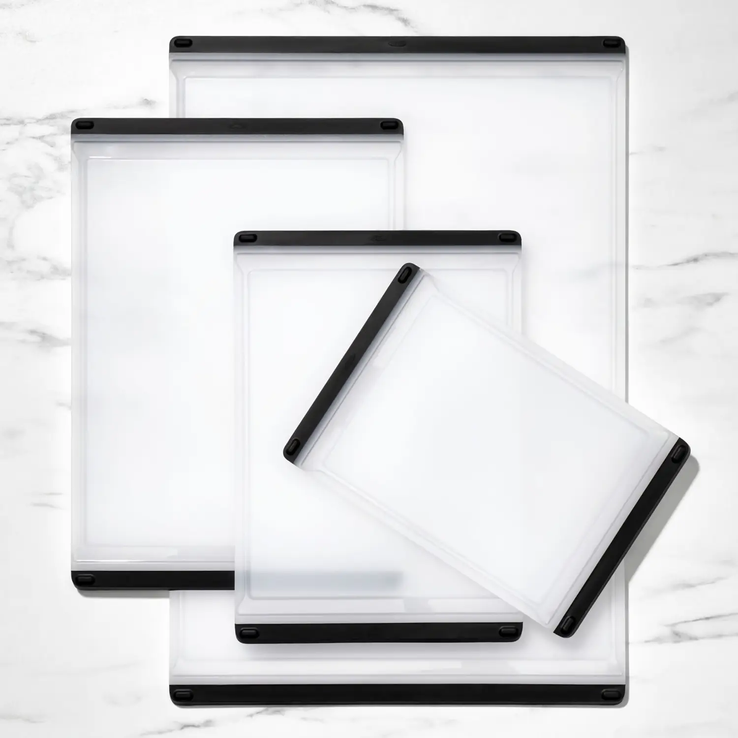 Prezentowana deska do krojenia Good Grips o wymiarach 37,5 x 26,4 cm (dł. x szer.) wykonana została z nieporowatego, przyjaznego ostrzom tworzywa sztucznego w mleczno-czarnym kolorze. Idealnie sprawdzi się ona do krojenia zarówno warzyw jak i mięsa. Możliwość używania dwóch stron zapewnia większą wygodę i higieniczność - dodatkowo jedna ze stron ma rowki zatrzymujące soki, co ułatwia zachowanie porządku. Ścięte krawędzie ułatwiają z kolei podnoszenie z blatu, a antypoślizgowe nóżki zapewniają odpowiednią stabilność. Deska jest łatwa w utrzymaniu w czystości - nadaje się ona do mycia w zmywarce.