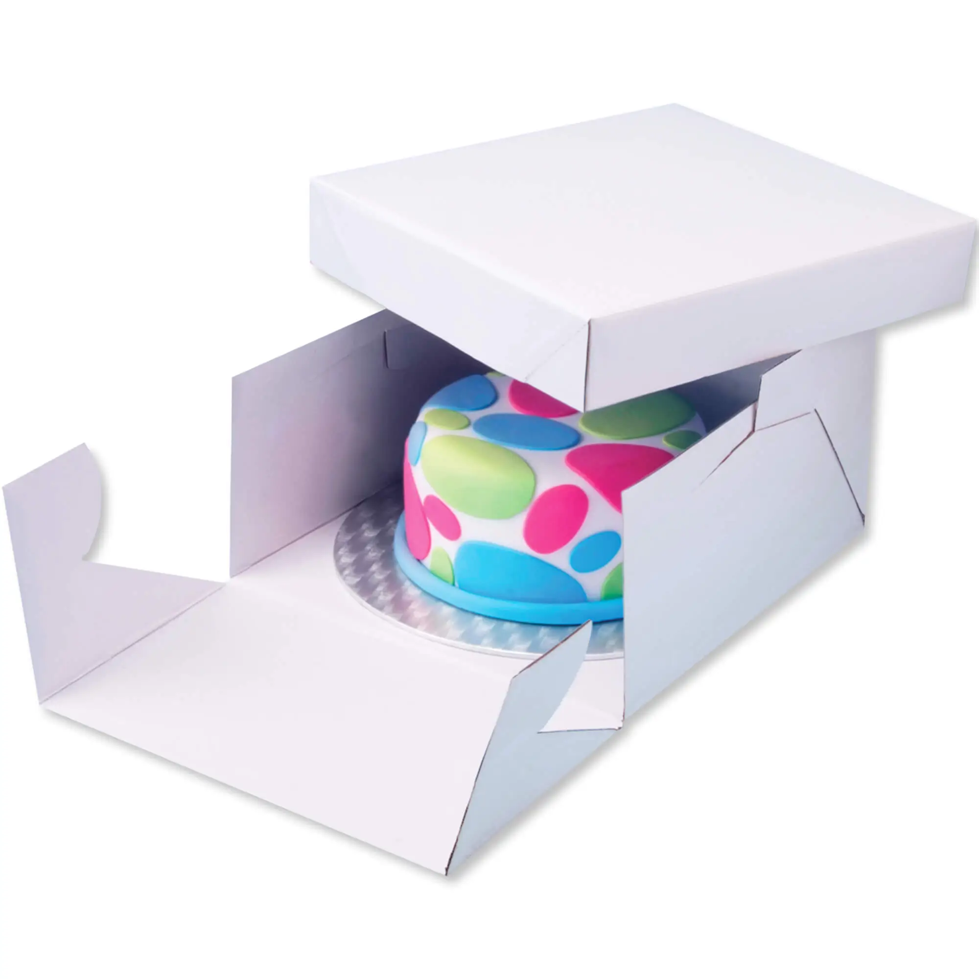 Praktyczny zestaw składający się z solidnego pudełka i okrągłej deski. Doskonały do przechowywania, prezentacji oraz bezpiecznego transportu ciast, tortów i innych wypieków.
