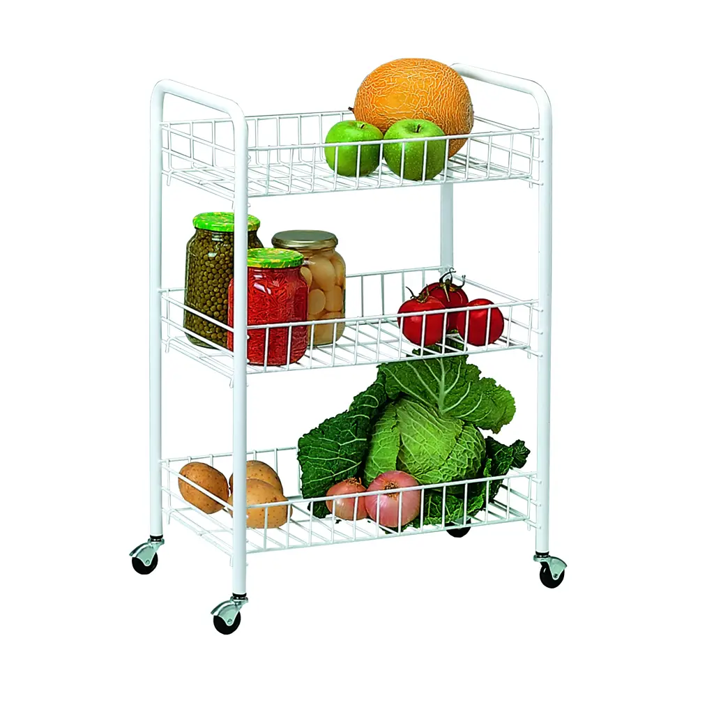 Trzy pojemne półki zapewniają mnóstwo miejsca na przechowywanie różnorodnych przedmiotów, od artykułów spożywczych i naczyń kuchennych, po kosmetyki, akcesoria do sprzątania czy narzędzia. Dzięki mobilnej konstrukcji z kółkami, wózek można łatwo przemieszczać z miejsca na miejsce, co pozwala na wygodny dostęp do znajdujących się na nim przedmiotów zawsze, kiedy tego potrzebujesz.