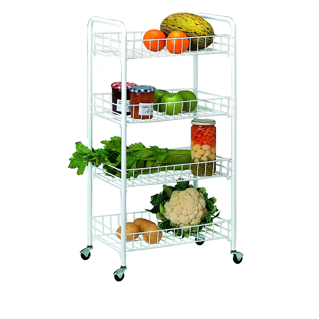 Cztery pojemne półki zapewniają mnóstwo miejsca na przechowywanie różnorodnych przedmiotów, od artykułów spożywczych i naczyń kuchennych, po kosmetyki, akcesoria do sprzątania czy narzędzia. Dzięki mobilnej konstrukcji z kółkami, wózek można łatwo przemieszczać z miejsca na miejsce, co pozwala na wygodny dostęp do znajdujących się na nim przedmiotów zawsze, kiedy tego potrzebujesz.