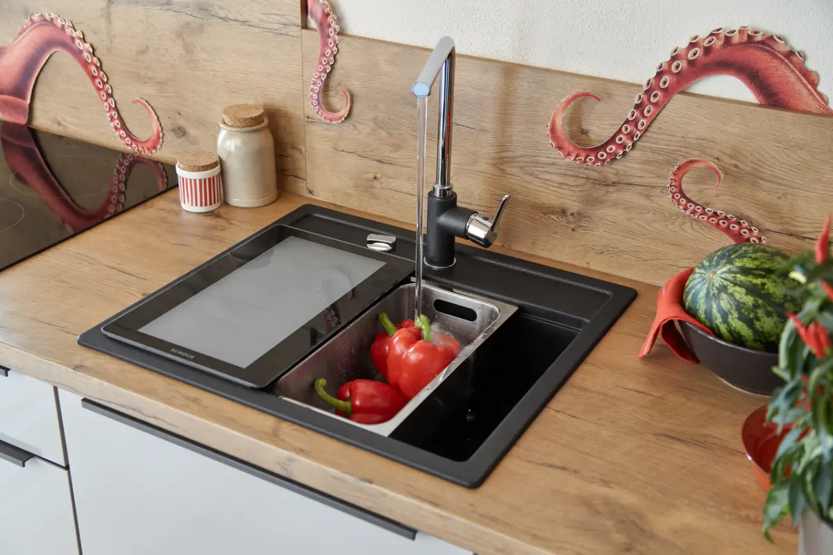 Zlew wykonany jest z materiału CRISTALITE. jest to połączenie 80% kwarcu (najtwardszego składnika granitu) z akrylem. Materiał ten jest odporny na uszkodzenia i zarysowania. Jest odporny na zapachy i bezpieczny dla żywności. Dotatkowo jest odporny na niską i wysoką temperaturę.