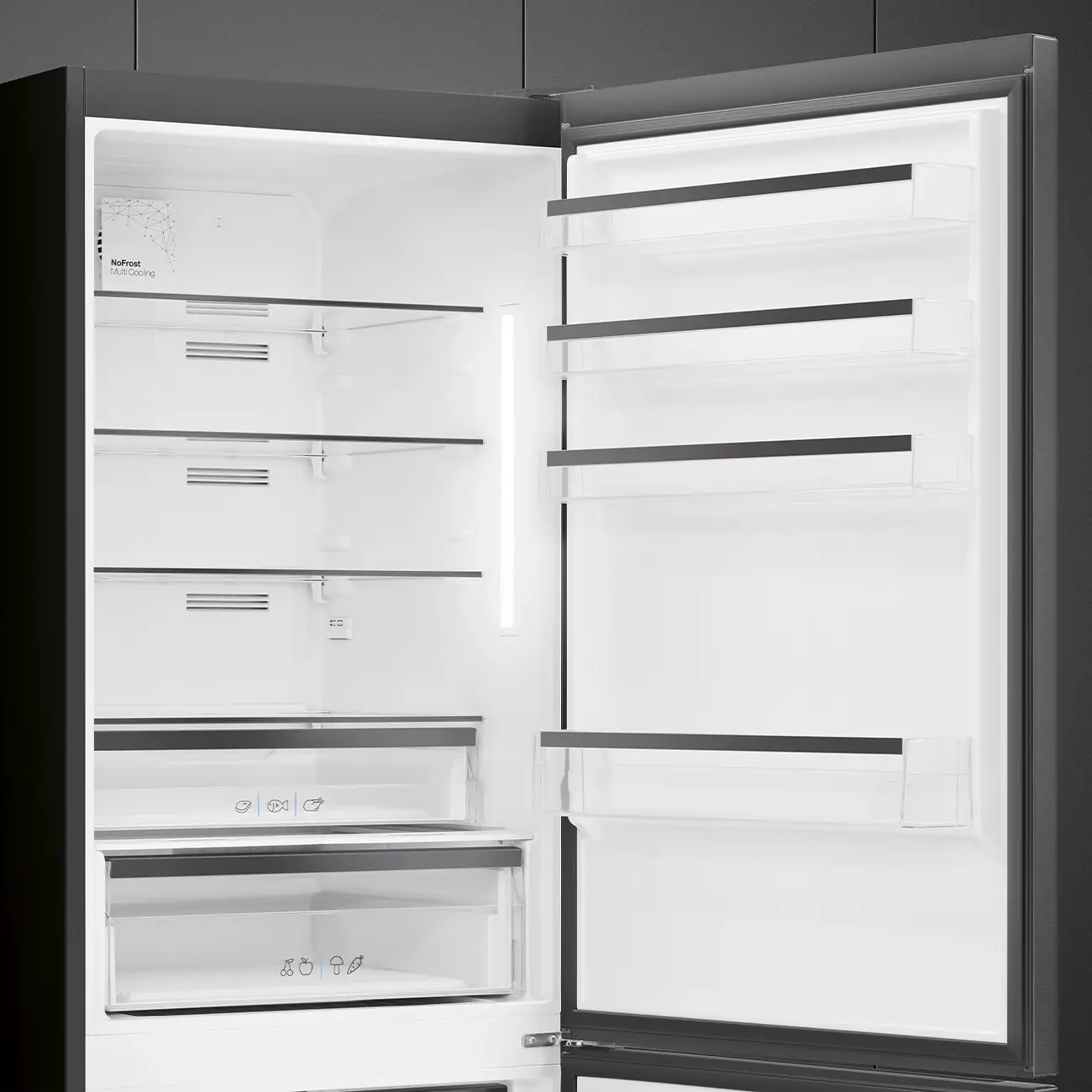 - Kolor profili półek na drzwiach: Dark Inox Look
