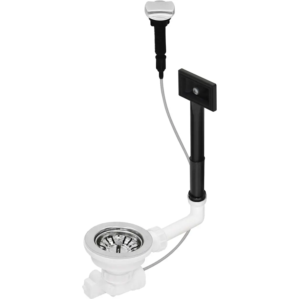 Zestaw odpływowy KITSTR z korkiem automatycznym, prostokątnym przelewem oraz okrągłym pokrętłem do zlewozmywaków.