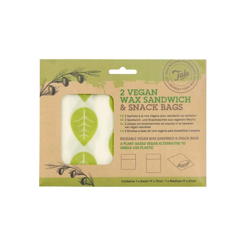 W 100% wegańskie i ekologiczne woreczki woskowijki od marki Tala wykonane są z naturalnej bawełny pokrytej naturalnymi woskami: sojowym, kandelila (wosk z wilczomleczu) i żywicą drzewną. Woski pozyskiwane są w sposób organicznych, a ich produkcja odbywa się bez udziału pestycydów. W woreczkach można przechowywać produkty spożywcze, świetnie sprawdzi się na kanapki do pracy lub do szkoły. W zestawie znajdują się dwie woskowijki: