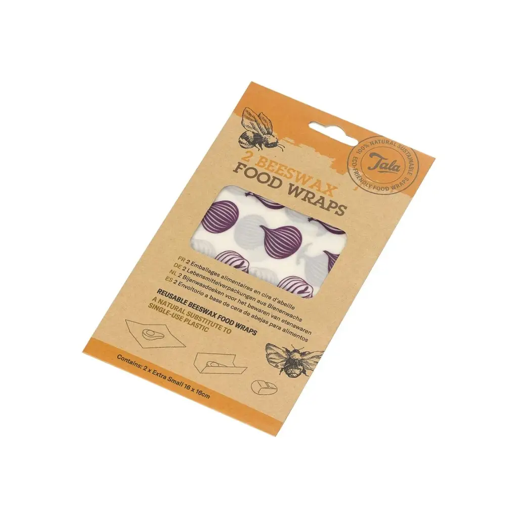 Wielorazowe, wegańskie woskowijki marki Tala wykonane są z naturalnych składników tj. bawełny pokrytej mieszanką składników (woskiem pszczelim, olejkiem jojoba, oraz organiczną żywicą drzewną). Woskowijki przeznaczone są do pakowania żywności, świetnie sprawdzą się jako ekologiczny zamiennik folii spożywczej. W zestawie znajdują się 2 sztuki, każda z nich w rozmiarze XS (16 x 16 cm). Aby szczelnie zamknąć woskowijkę należy rozgrzać ją w dłoni, tak aby stała się elastyczna. Produkt jest w pełni biodegradowalny. Na produkcie naniesione są oryginalne wzory cebuli.